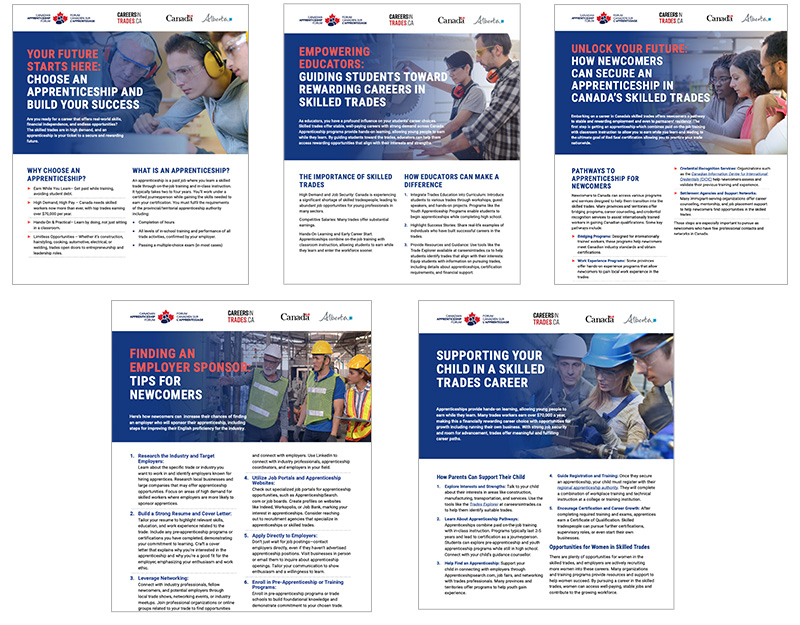 These five flyers were created through our work with the Province of Alberta to help youth and job seekers navigate their first steps into the skilled trades. The information is relevant across Canada and offers clear, accessible guidance for anyone exploring apprenticeship opportunities, from choosing a trade to finding an employer sponsor.